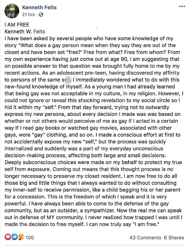 Kenneth opened up to daughter, identified as Rebecca Mayes, before sending out emails and write up on Facebook at the beginning of the Pride Month.