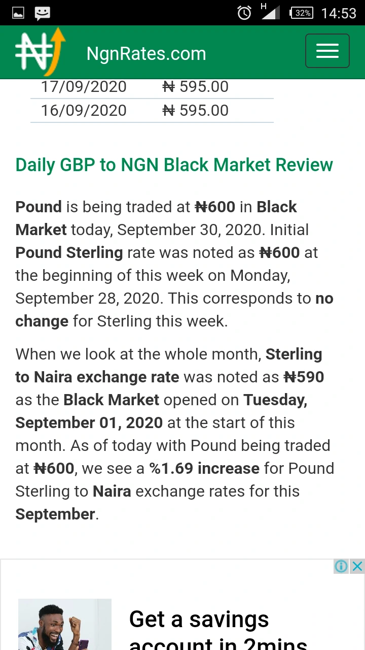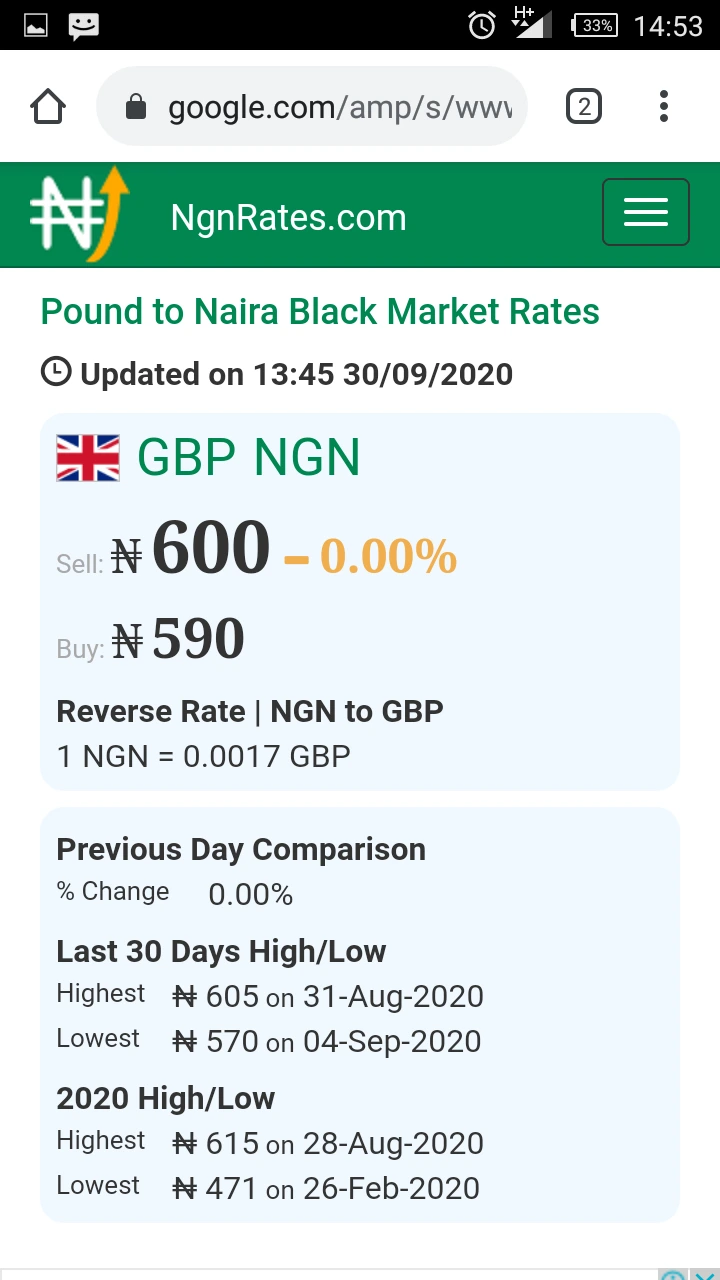 But in the black market, according to NgnRates.com, one Pound Sterling is sell at the rates of N600.00 and they buy it at the rates of N590.00.
