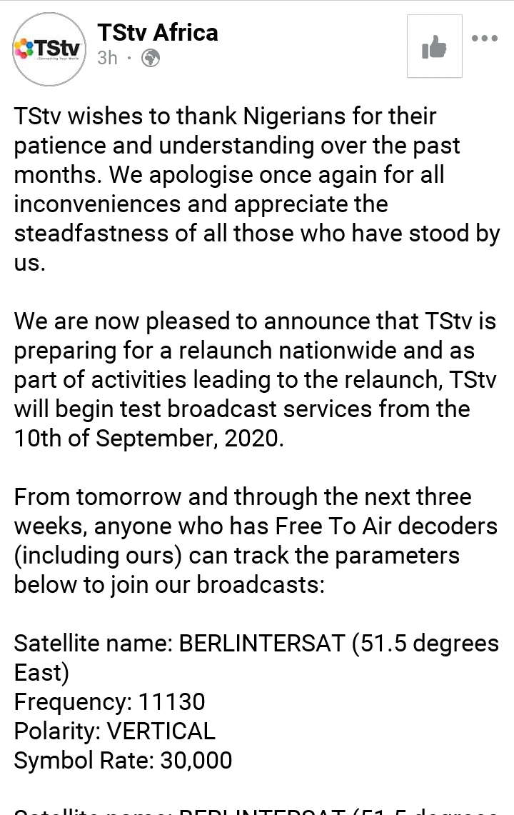 We are now pleased to announce that TStv is preparing for a relaunch nationwide and as part of activities leading to the relaunch, TStv will begin test broadcast services from the 10th of September, 2020