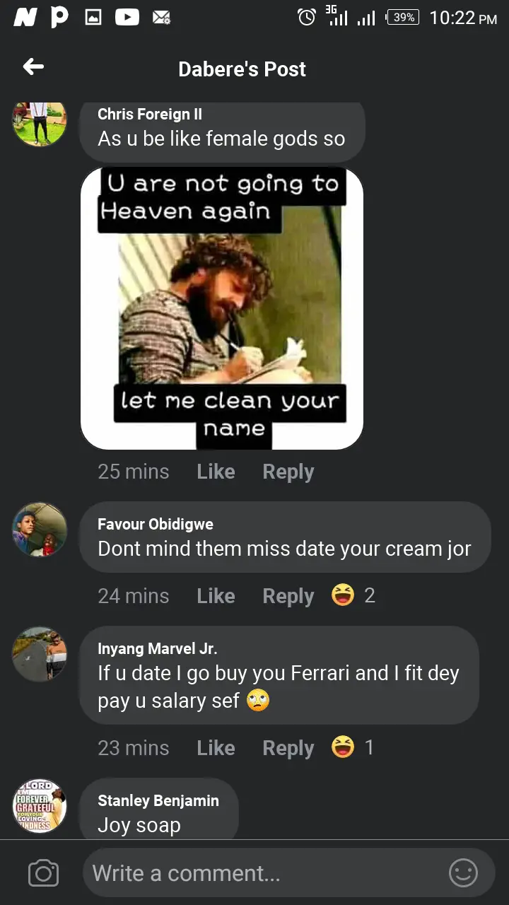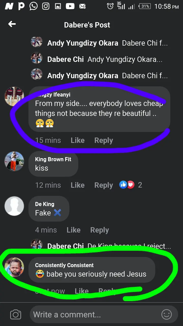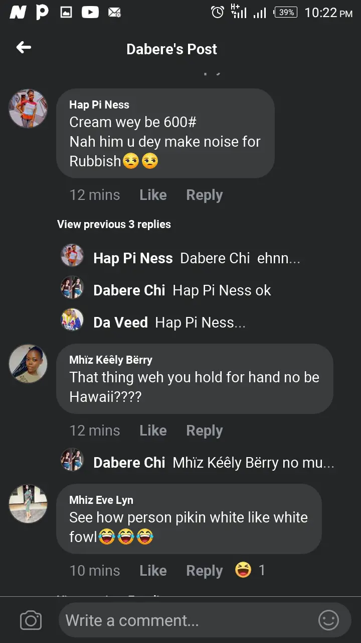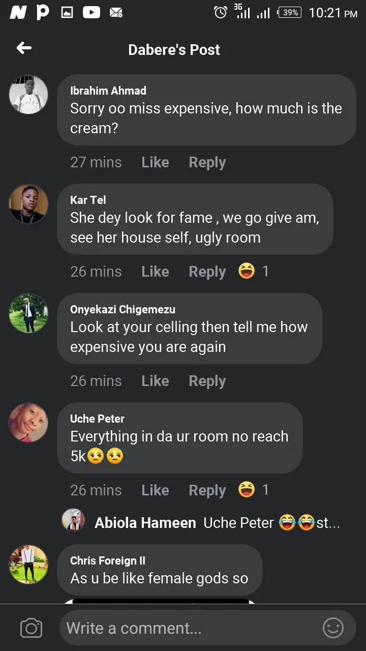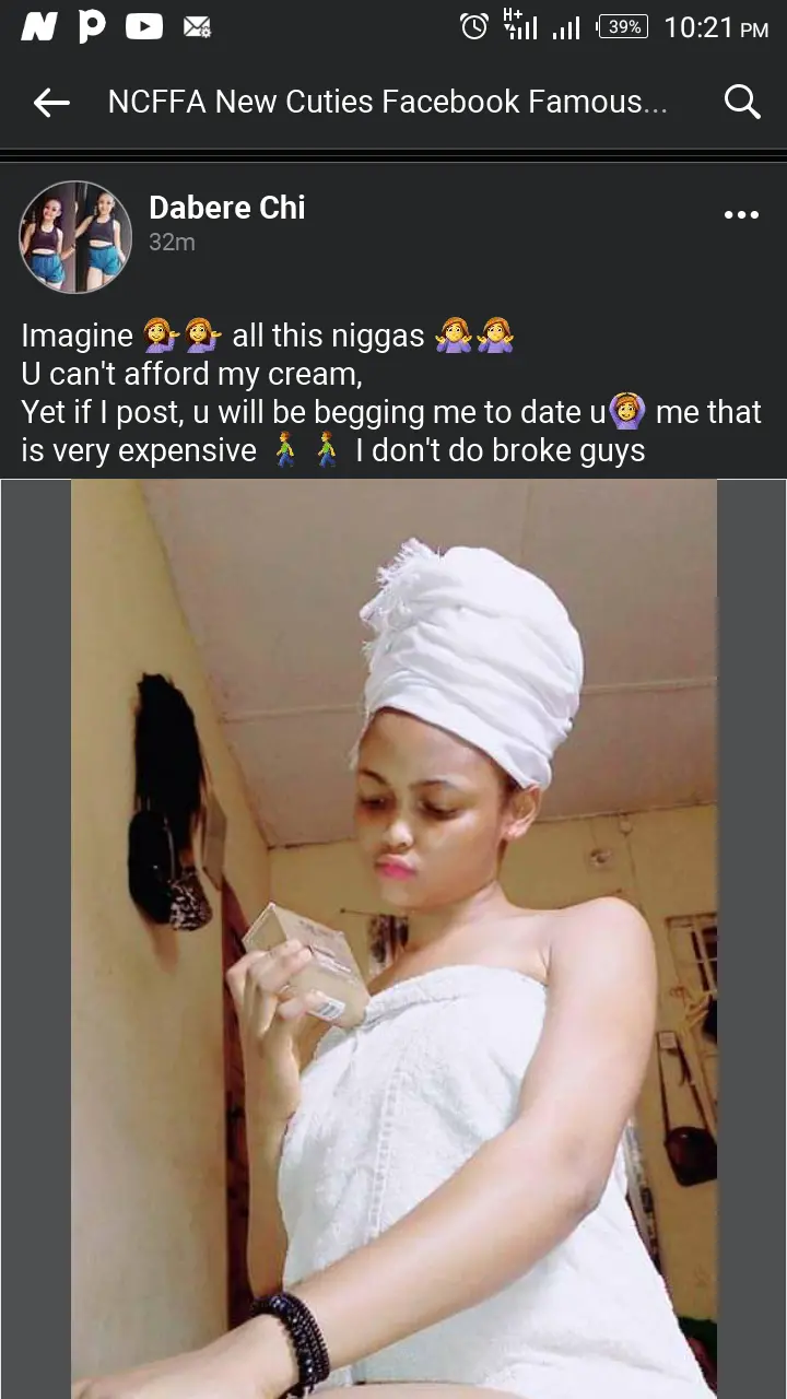 In my article today, I will be sharing with you all a controversial post I came across while scrolling through my news feed. The post which was shared by a gorgeous looking Igbo girl from Owerri, Imo State identified as Dabere Chi who claimed to be 16 years old. The post which she shared cause outrage among some Facebook users that they started blasting her. She captioned the post as "Imagine all this niggas, you can't afford my cream, yet if I post you will be begging me to date you. I'm very expensive and I don't date broke guys."