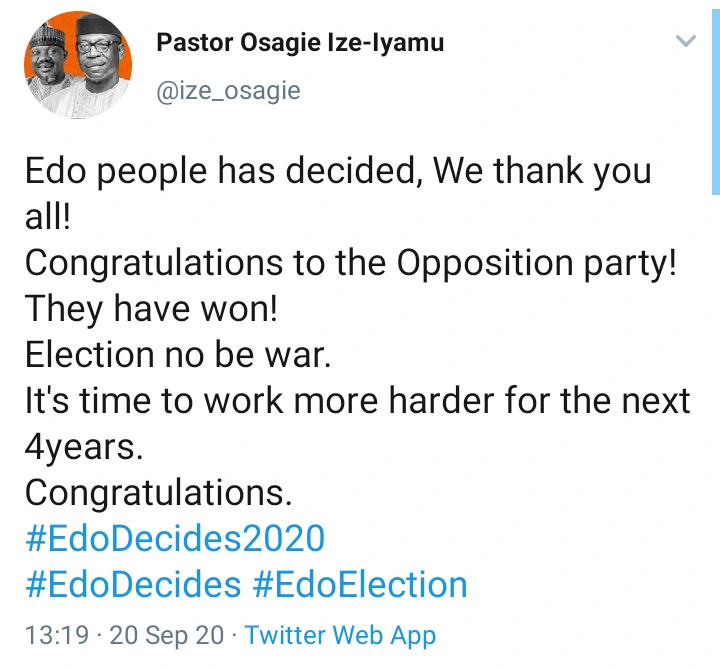 On his Twitter handle, Pastor Osagie Ize Iyamu said that, the people of edo state have decided already and that he thanked them all. He further said, congratulations to the opposition party APC because they have won the election.