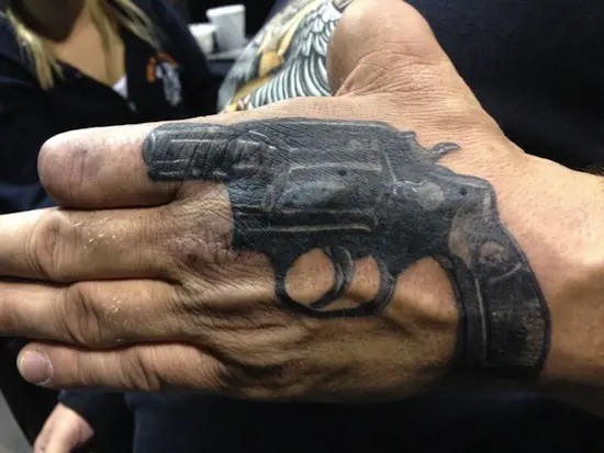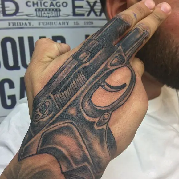 This realistic tattoo is a combination of artistic knowledge and innovation from the inker. It features the drawing of a gun on hujab beings hands.