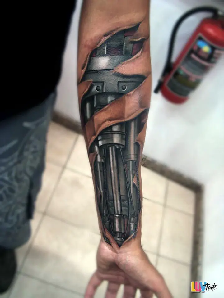 This is a 3D Tattoo. These tattooes are difficult to achieve, they require excellent attention to detail and a very talented tattoo artist to create such a unique effect. They bring out the cyborg in a man to reality.