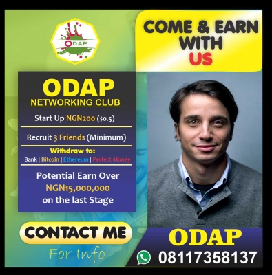 ODAP is an mlm Platform that's pay users to learn with the cost of ₦200 and 3 Active people. With ₦200 members can earn more than ₦15,000,000 in the last stage. Suitable for all country that support BITCOINS, ETHEREUM & PERFECT MONEY with BANK TRANSFER.