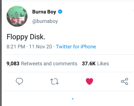 After the video of Davido claiming to be the biggest artist in Nigeria went viral. Burna boy took to Twitter to throw a shade at Him by Writing "Floppy Disk" on his page.