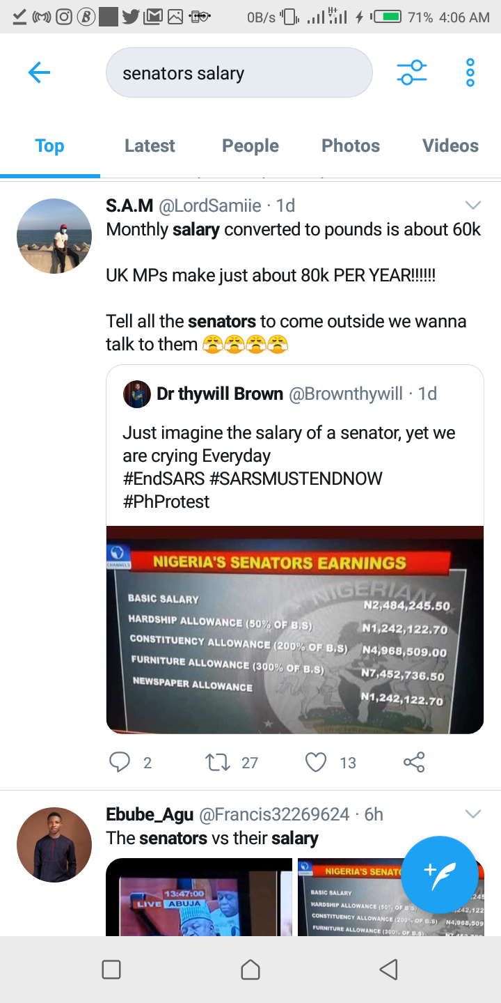 : Nigerian Senator earns ₦162 million ($450,000) annually in allowances, and ₦9 million ($25,000) as basic salary, the American President, for instance, only earns $450,000 (including bonus) annually. After we are done with #SARSMUSTEND we are coming for you senators!