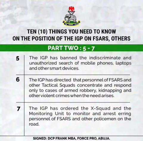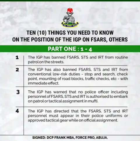 Following the Recent happening that has led to the wide call to put a stop on the activities of the Special Anti Robbery Squad that is popularly known as SARS, the Nigeria Police have released a document that is titled "10 Things You Need to Know on The Position of The IGP on FSARS and Others"