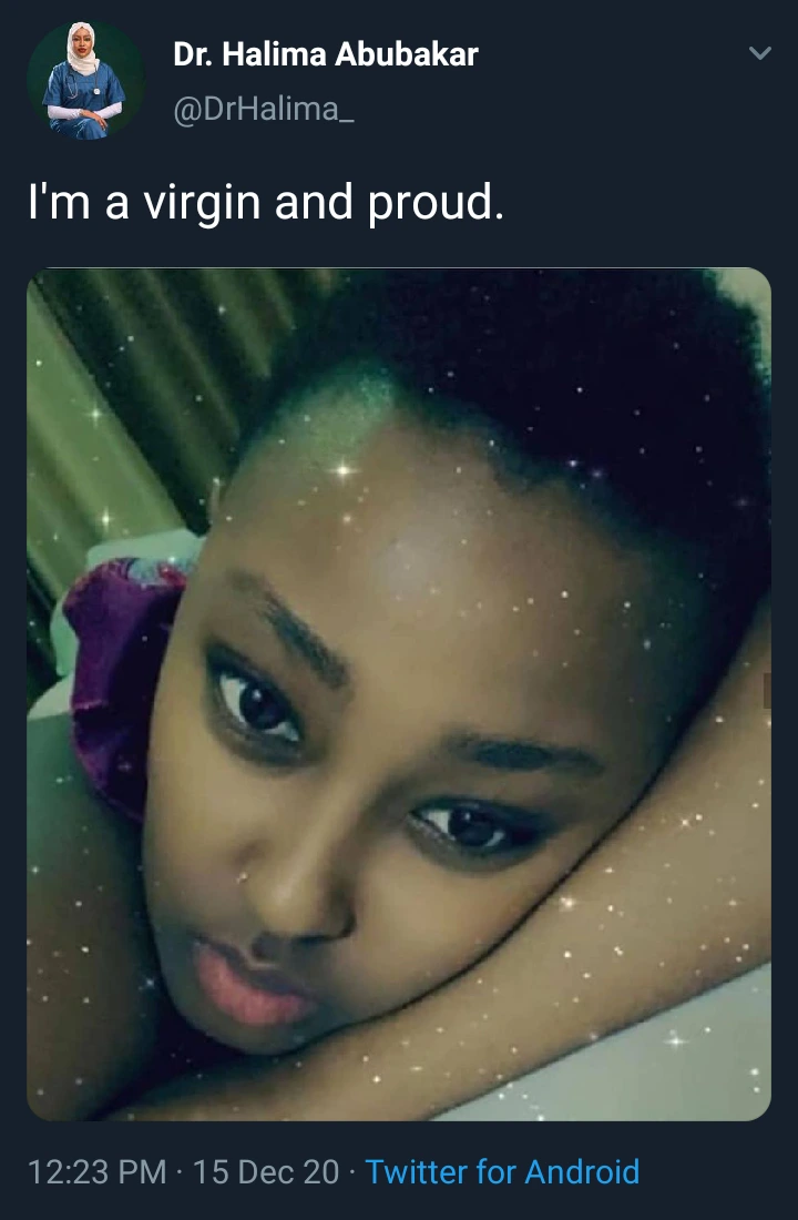 However, in her most recent tweet, doctor Halima Abubakar claimed that she was still a virgin. A claim that has now left people wondering how she could tell that Nigerian men are not romantic when she possibly hasn't even tried having an affair with anyone of them.