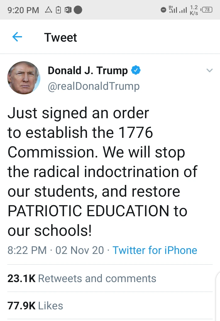 He added that, with that, his administration will be able to stop the radical indoctrination of the students of the United States of America and consequently restore patriotic education to the American schools. In his words, he tweeted thus, "Just signed an order to establish the 1776 Commission. We will stop the radical indoctrination of our students, and restore PATRIOTIC EDUCATION to our schools!"