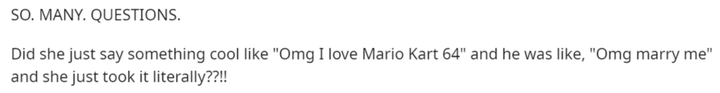 Another wrote, “Did she just say something cool like, ‘Omg, I love Mario Kart 64’ and he was like, ‘Omg, marry me’ and she just took it literally?!â€