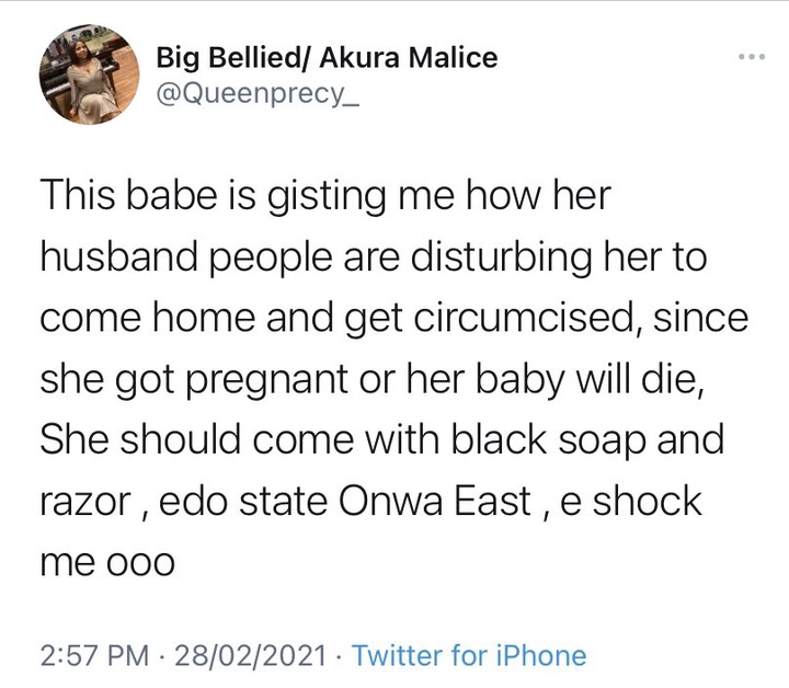 She went further to reveal that her friend has been asked to come along with Razor and black soup to Edo State for the circumcision to take place.