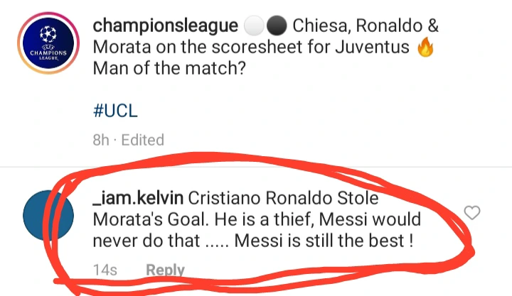 @iam.kelvin wrote, "Cristina Ronaldo Stole Morata's Goal. He is a thief, Messi would never do that... Messi is still the best".