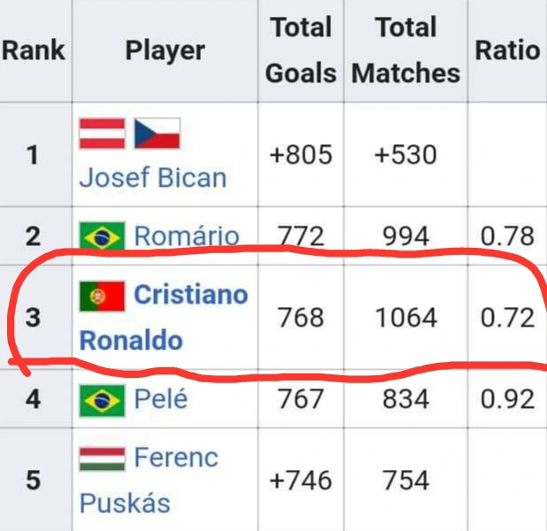 Only 2 players apart from Cristiano Ronaldo has ever reached such an achievement. They are; Romario and Pele who both scored 772 goals and 767 goals respectively.