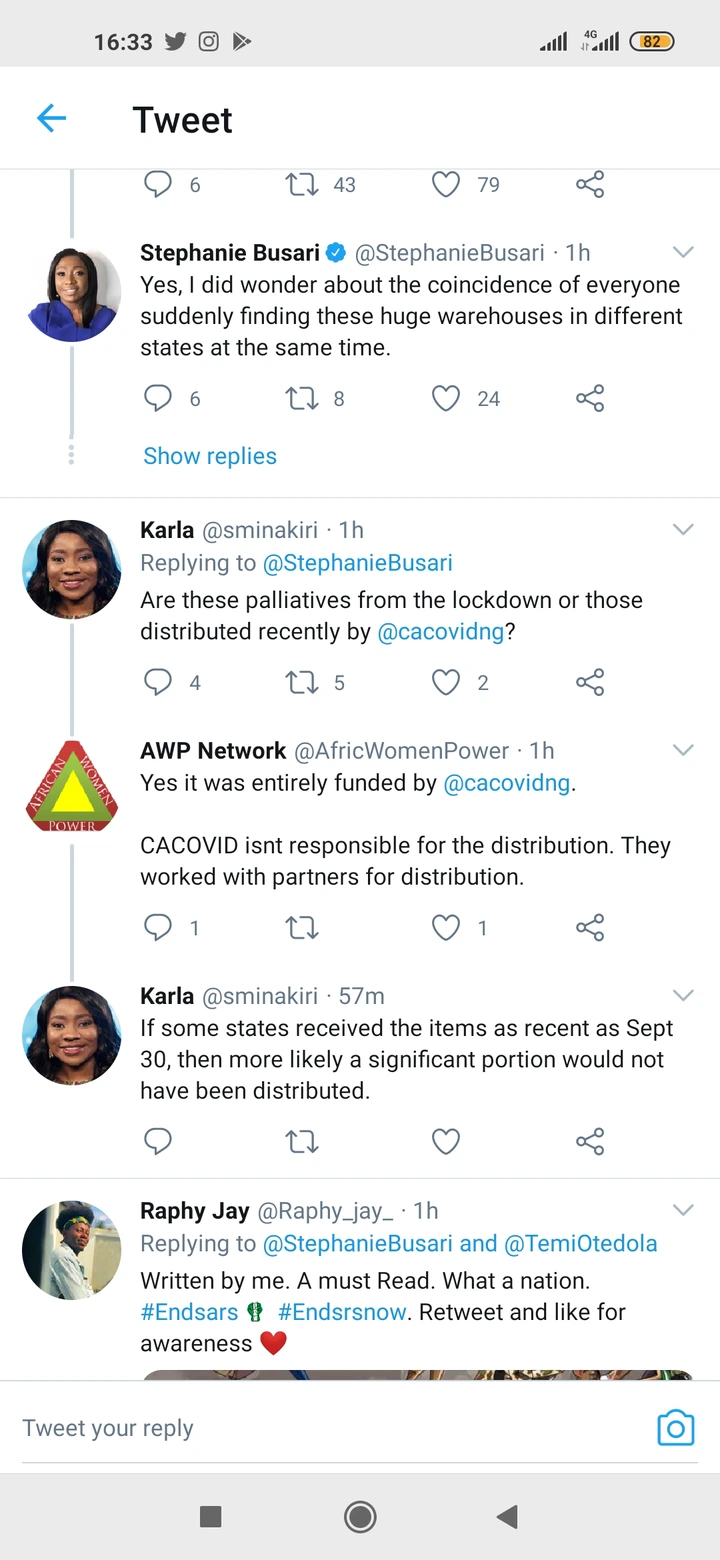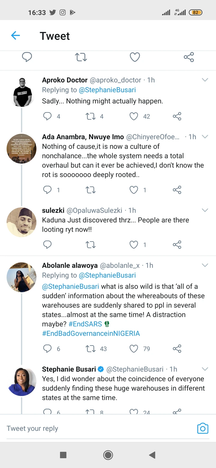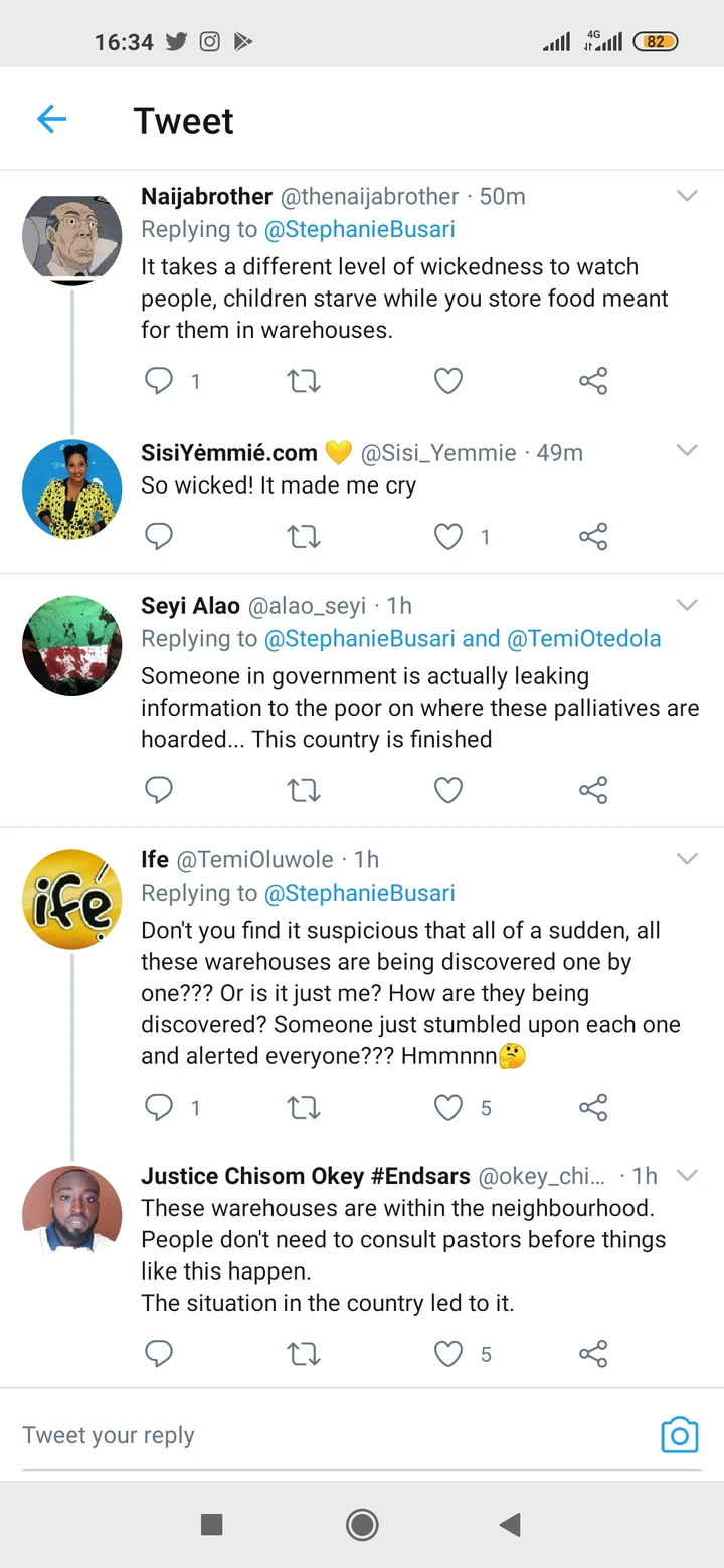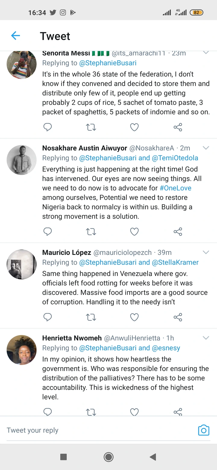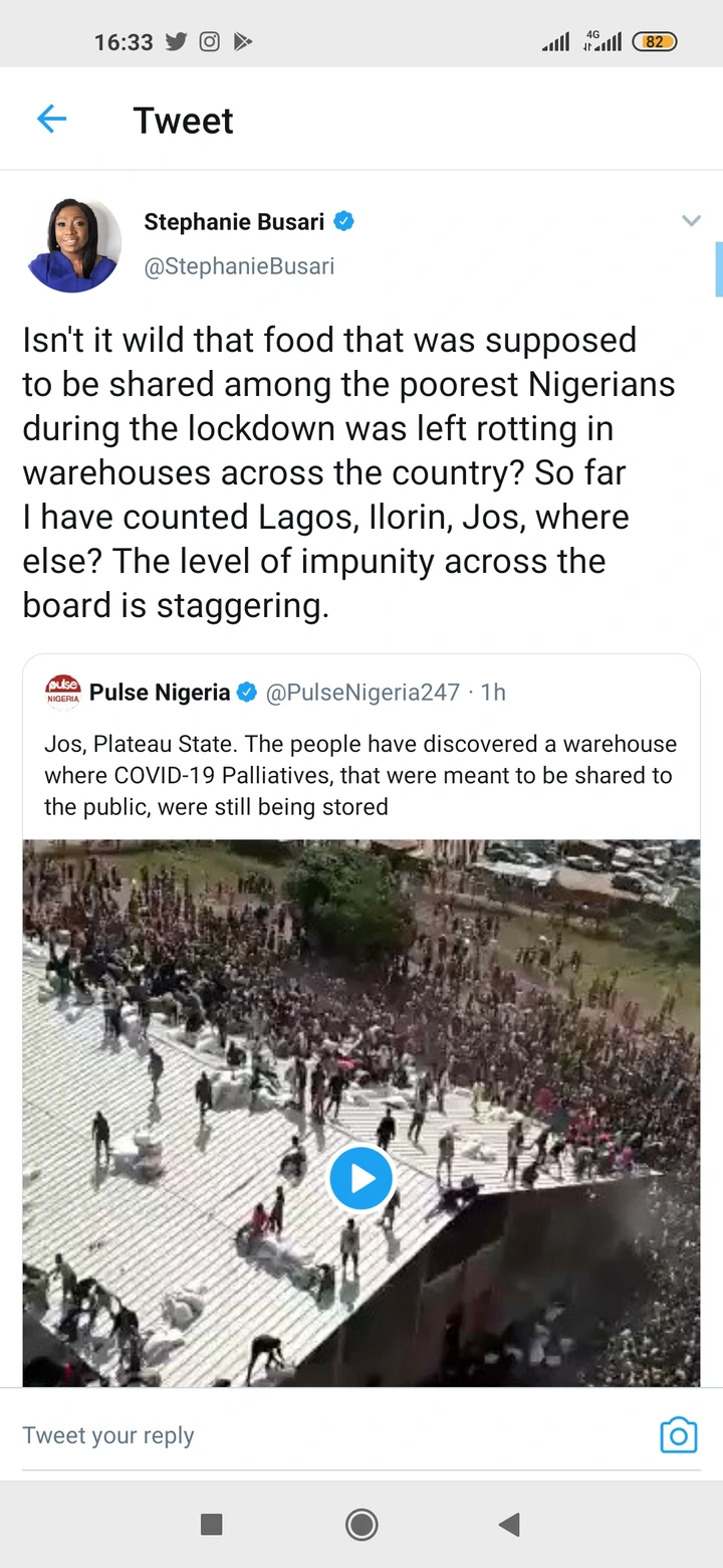 "Isn't it wild that food that was supposed to be shared among the poorest Nigerians during the lockdown was left rotting in warehouses across the country? So far I have counted Lagos, Ilorin, Jos, where else? The level of impunity across the board is staggering."