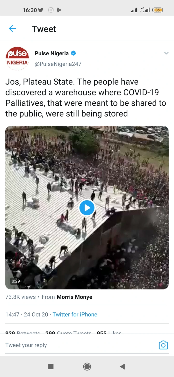 First for a while in the country, it was about the issue of end SARS movement, but it seems the attention has seem to divert especially since Buhari's speech days ago. Going by what has trended online, the issue of Covid-19 Palliatives been discovered has been the issue for a while now first it was in Lagos, yesterday it was in Osun and today it's in Plateau, Jos.