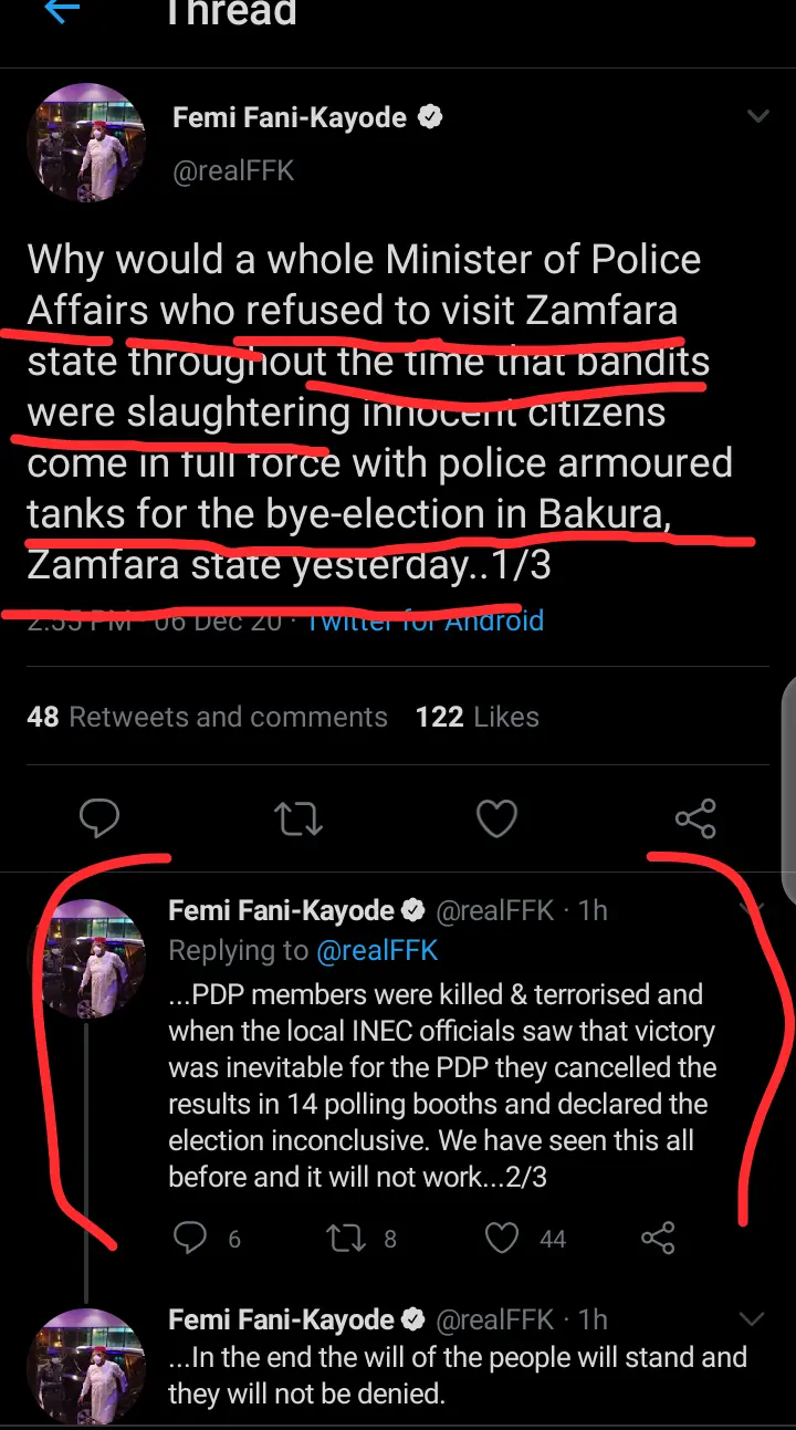 "Why would a whole Minister of Police Affairs who refused to visit Zamfara state throughout the time that bandits were slaughtering innocent citizens come in full force with police armored tanks for the bye-election in Bakura, Zamfara state yesterday?"