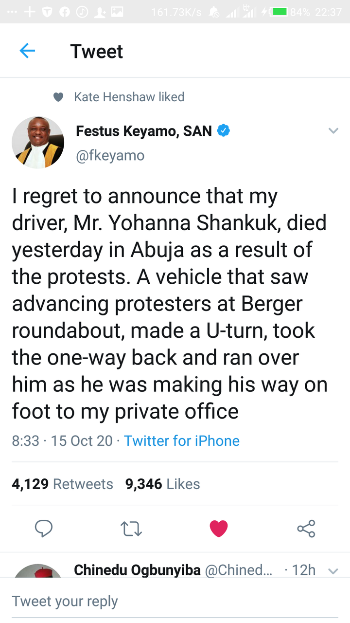 Few hours Ago, Festus Keyamo, SAN took to his twitter page to announcea very sad new, he said his lost his driver as a result of the Abuja protest yesterday.