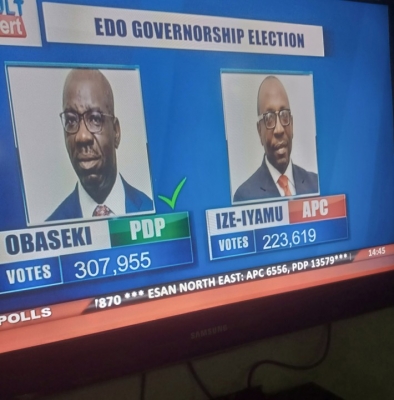 Godwin Obaseki of People’s Democratic Party has been declared winner of the Edo State governorship election held on Saturday. Obaseki polled a total of 307, 955 votes to defeat All Progressives Congress’s Osagie Ize-Iyamu-Iyamu who got 223, 619 votes. |