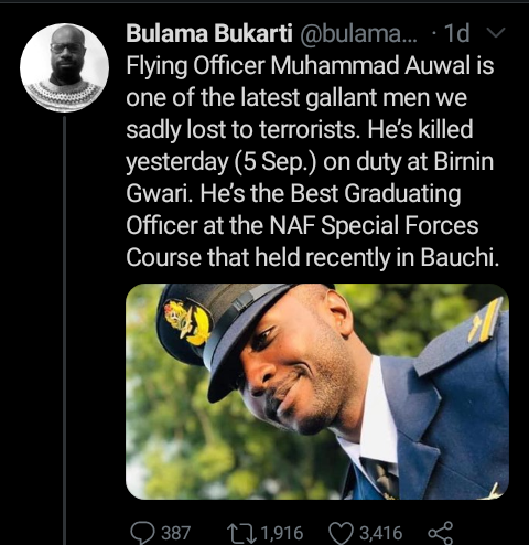 He was said to have been killed by terrorists while on duty at Birnin Gwari, a local government area of Kaduna state. According to Bukarti, he was the best graduating officer in one of the Nigerian Air Force courses which were recently held in Bauchi State. (See his caption below)