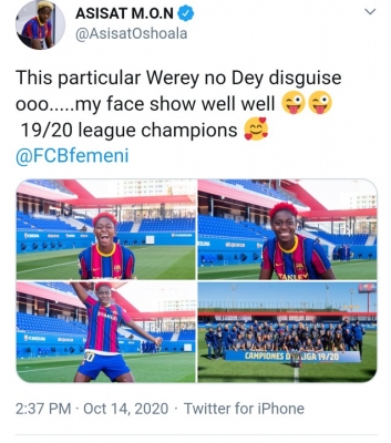 The Spanish Football Federation ended the Liga Primera Iberdrola abruptly on May 6th, 2020 due to the COVID-19 pandemic and Barcelona Femeni were declared champions of the 2019/2020 season. It is the first time that Barca have won the league since the 2014/2015 season.The trophy presentation could not be made at the time due to the lockdown. Football has since resumed and the Liga trophy was presented to Barca last weekend. Asisat Oshoal took to Twitter and Instagram yesterday to show off the trophy.