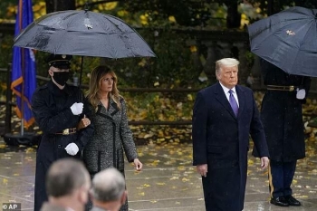 Melania sheltered under an umbrella during the visit to Arlington National Cemetery on a wet, dreary Veterans Day on Wednesday